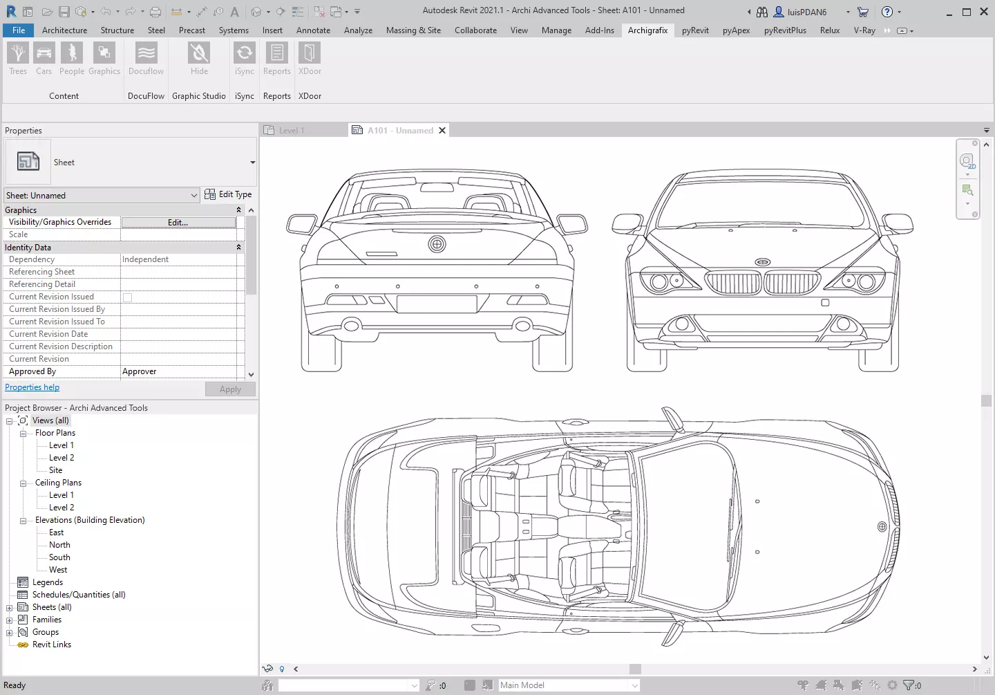 Archi car families are intelligent detail elements that are visible in all orthogonal views. These collections are organized in different car types, from passenger to commercial cars in all sizes. Placing the family in plan makes it automatically visible in the other views. Possible to adjust the detail level with the native view detail level from revit.